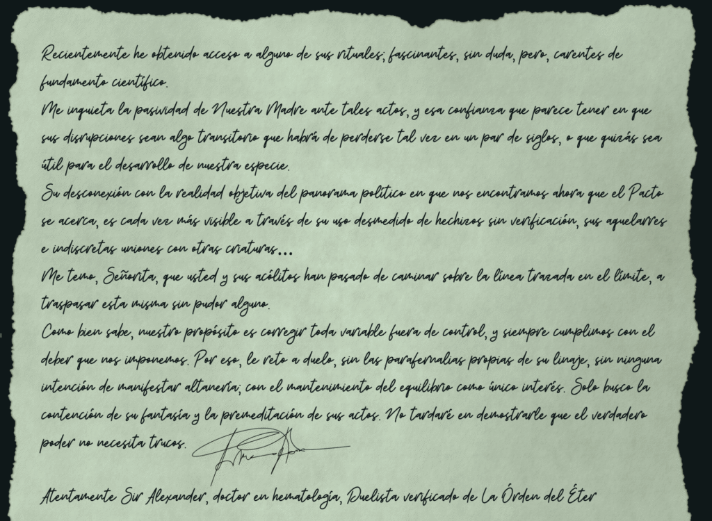 Es un miembro del linaje de Venecia quien, desafiando la voluntad de su líder, la sagaz señorita Tofana —maestra en el sutil arte del veneno— y consciente de que, en el terreno de la alquimia y los compuestos, los londinenses podrían desvelar sus intrigas, opta por una vía más directa y ruidosa: reta a Samael Brand a duelo.